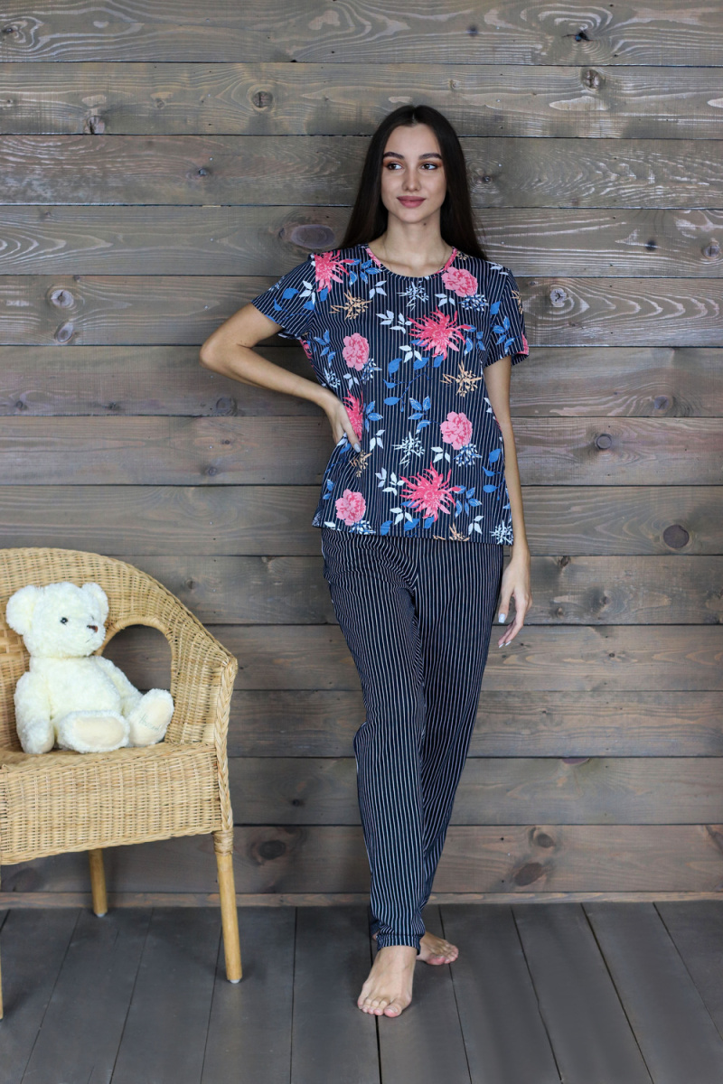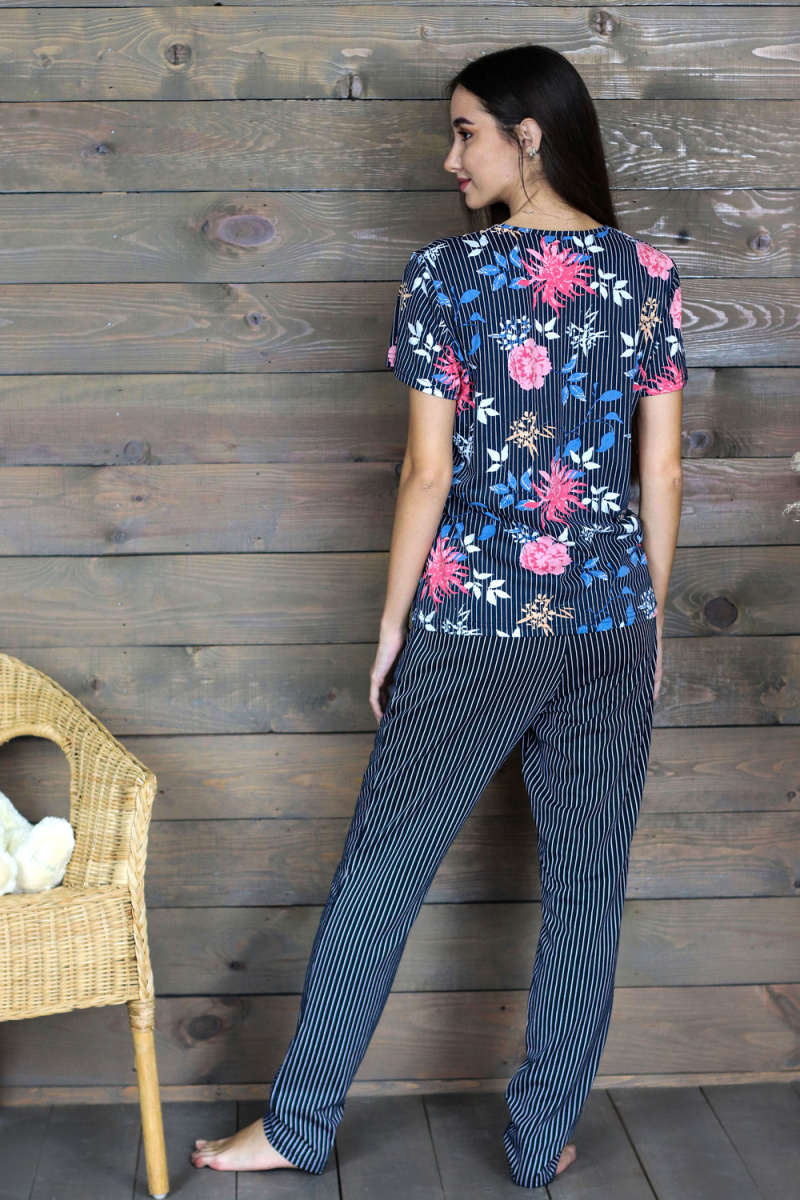 Костюм женский с брюками. Футболка свободного силуэта, с втачным коротким рукавом. Горловина округлой формы. Низ изделия подогнут. Брюки свободного силуэта, с притачным поясом и карманами. Низ изделия подогнут.