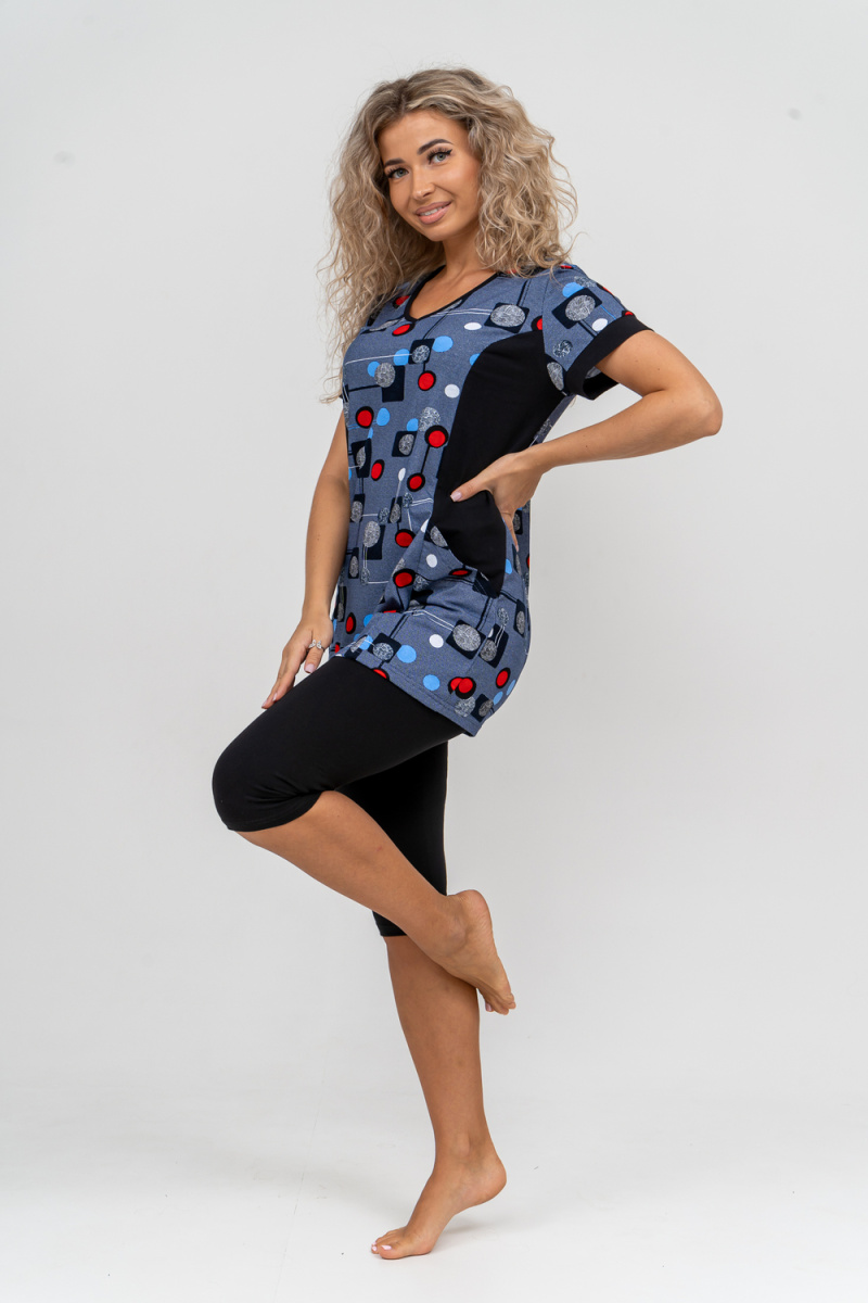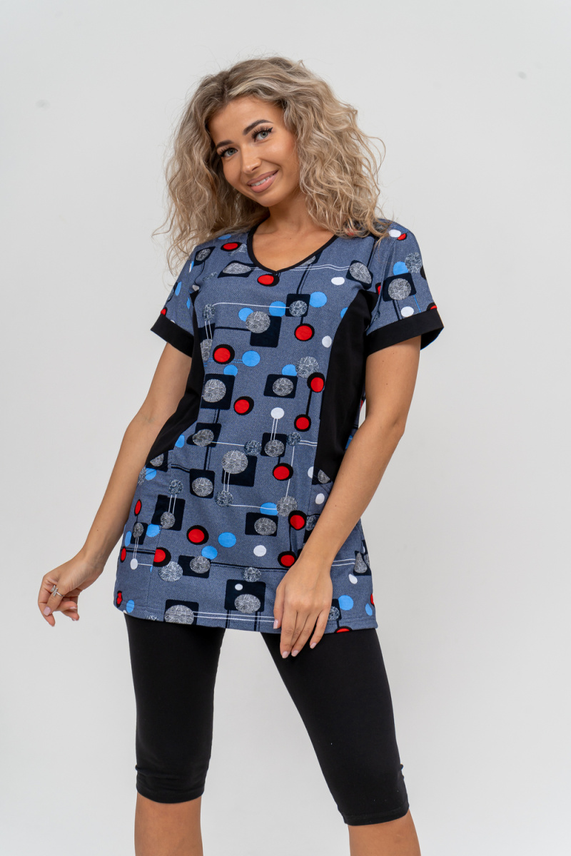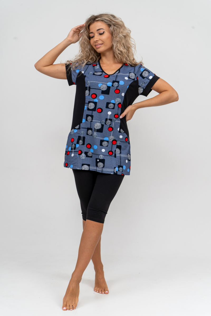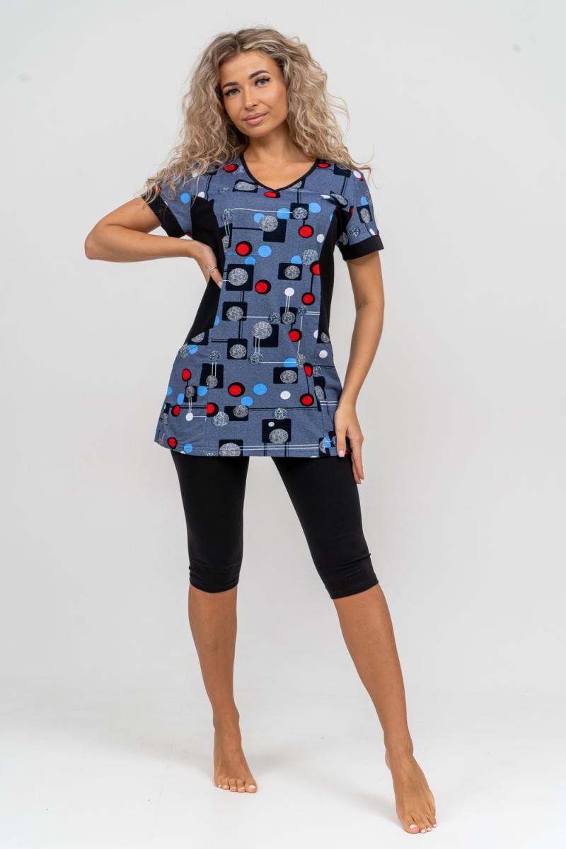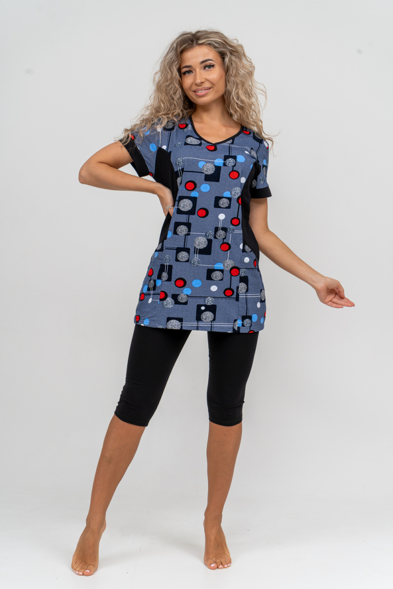 Женский костюм полуприлегающего силуэта состоит из туники и бриджей. 100% дышащий хлопок туники и эластичные бриджи несут в себе удобство при носке, гигроскопичность и износостойкость. V-образный вырез горловины придаёт изделию женственный вид. Для удобства туника имеет вместительные накладные карманы и втачные рукава с манжетами. Рельефы на полочке изделия создают идеальную посадку и безупречный внешний вид. Бриджи на резинке с высокой посадкой. В костюме такого плана Вы будете чувствовать себя комфортно как дома, так и на любимой даче. Эта двойка идеально подойдет для летнего отдыха на даче, на море или просто для девушек, которые хотят чувствовать себя уютно и комфортно дома. Летний женский костюм подходит для поездок и путешествий, загородного отдыха на природе, а также для получения лечения в больнице или санатории. Повседневное хлопковое изделие с бриджами - отличная идея для подарка любимой жене, маме, сестре или подруге на день рождения, 8 Марта или по любому другому приятному поводу. Рекомендация: дл