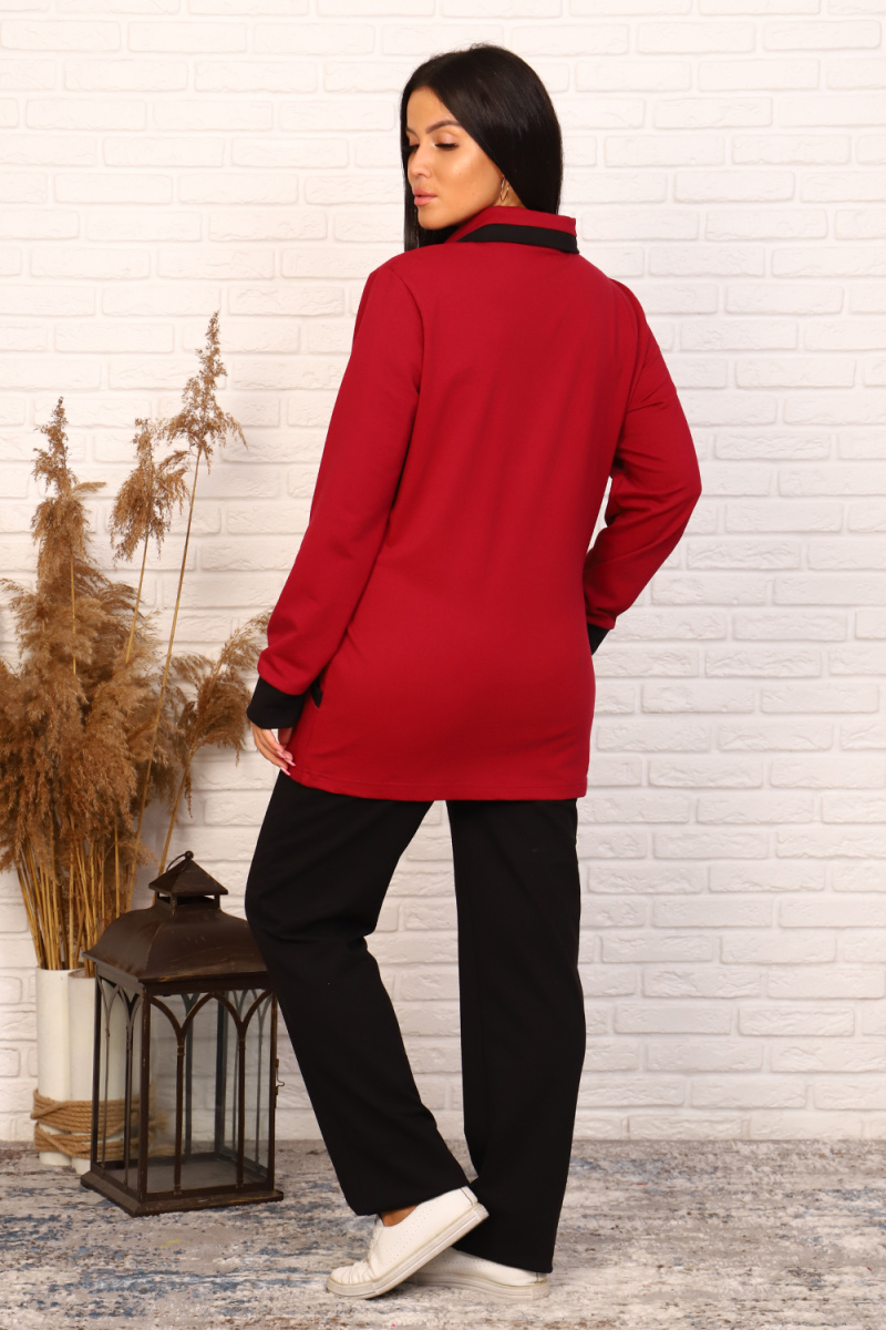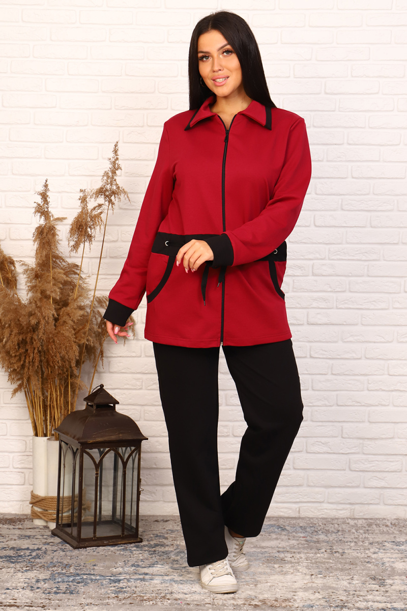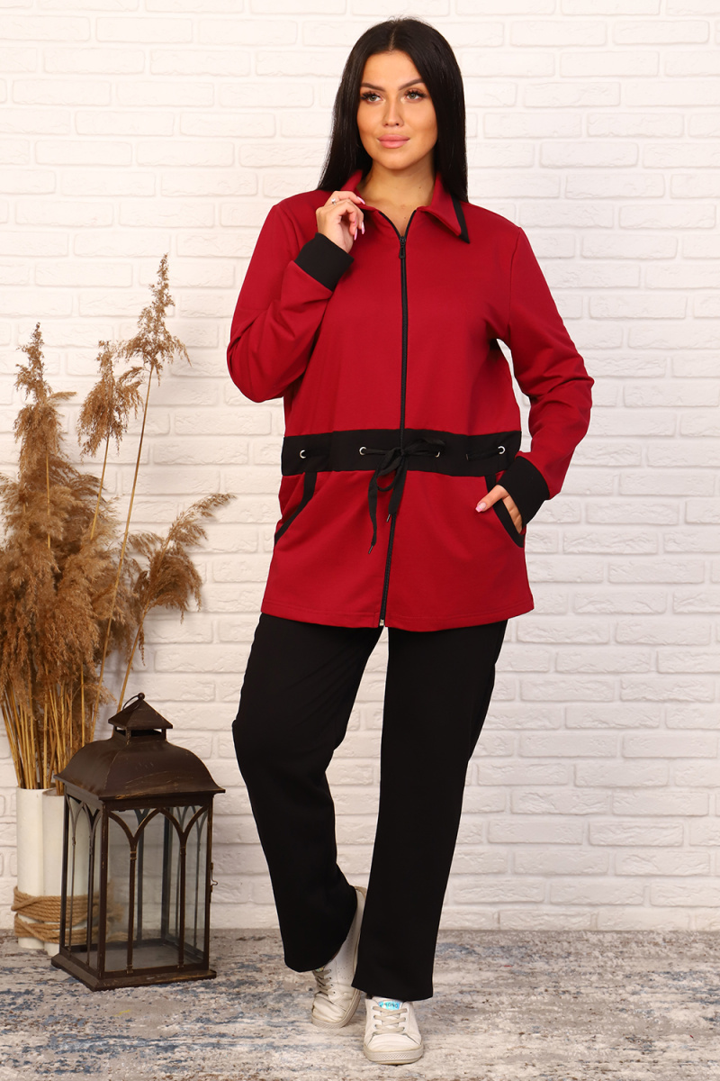 Спортивный женский костюм, состоит из кофты и брюк. Брюки прямого силуэта на резинке. Кофта удлиненная на молнии, на кулиске со шнурком. Два боковых кармана. Рукав длинный на манжете.